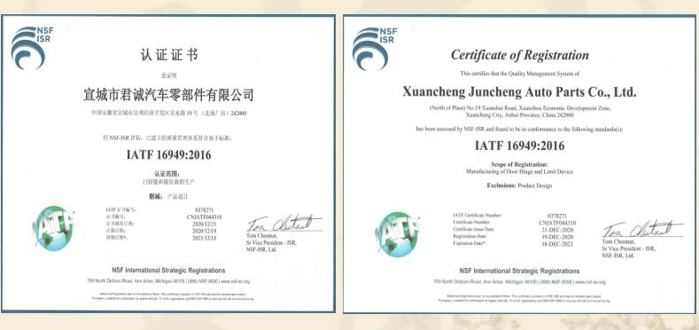宣城市君誠汽車零部件有限公司是專業生產各類汽車鉸鏈及限位器的民營企業,總投資3000余萬元,位于宣城高新技術產業開發(fā)區,緊鄰宣廣、宣蕪高速公路,地理位置優(yōu)越,交通便捷。是“國家高新技術企業、知識產權貫標企業、安徽省商標示范企業、安徽省科技型企業”,已獲得國家發(fā)明專利18項,實用新型發(fā)明專利4項。主要從事各類汽車門鉸鏈及限位器的設計、研發(fā)、生產、和銷售,具有專業的合作團隊。自2015年正式生產至今,已形成一整套完整的生產、質量管理體系。并已通過國家強制性產品認證“3C”體系認證及IATF16949國際質量體系認證。在生產設備上,公司擁... 【查看詳細】